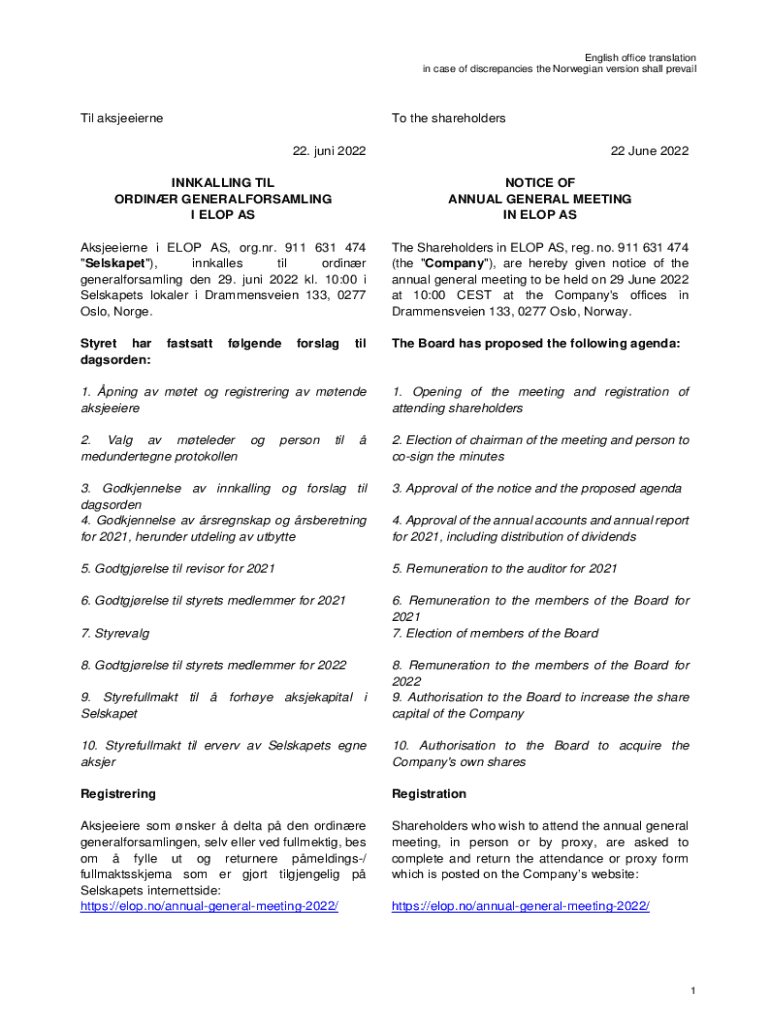 English office translation in case of discrepancies the Norwegian version shall prevailTil aksjeeierneTo the shareholders 22. juni 202222 June 2022INNKALLING TIL ORDINR GENERALFORSAMLING I ELOP ASNOTICE