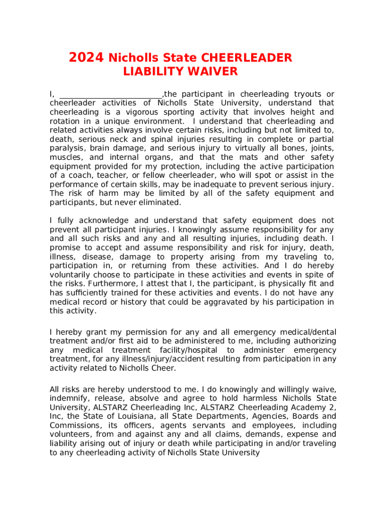 The Nicholls State Cheer (nichollsstatecheer) is a fillable form in MS Word extension required to be submitted to the required address to provide certain information. It must be completed and signed, which can be done in hard copy, or using a certain solution like PDFfiller. This tool lets you fill out any PDF or Word document directly from your browser (no software requred), customize it according to your needs and put a legally-binding e-signature. Once after completion, the user can send the Nicholls State Cheer (nichollsstatecheer) to the appropriate recipient, or multiple ones via email or fax. The editable template is printable as well because of PDFfiller feature and options offered for printing out adjustment. In both digital and physical appearance, your form will have got clean and professional appearance. Also you can save it as the template to use later, there's no need to create a new document from the beginning. All that needed is to customize the ready sample.