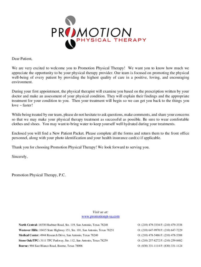 Dear Patient, We are very excited to welcome you to Promotion Physical Therapy! We want you to know how much we appreciate the opportunity to be your physical therapy provider. Our team is focused