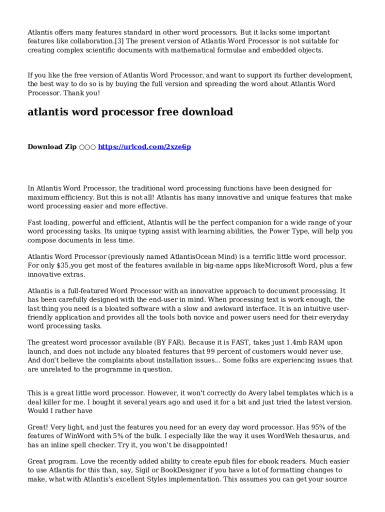 Atlantis offers many features standard in other word processors. But it lacks some important features like collaboration.[3] The present version of Atlantis Word Processor is not suitable for creating