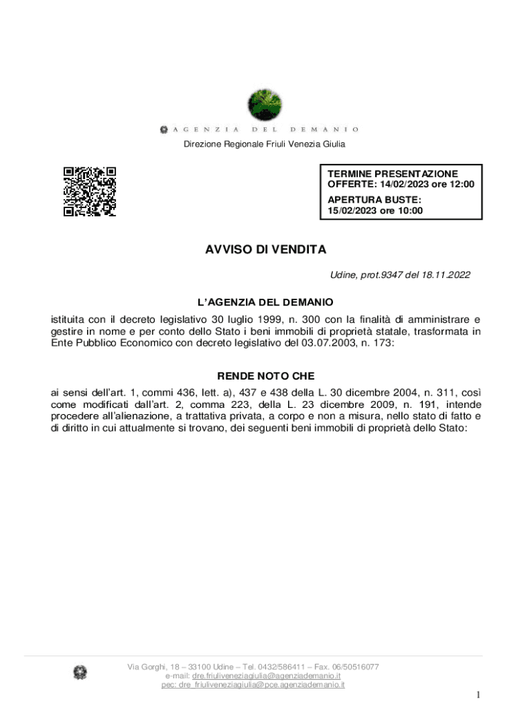 Direzione Regionale Friuli Venezia GiuliaTERMINE PRESENTAZIONE OFFERTE: 14/02/2023 ore 12:00 APERTURA BUSTE: 15/02/2023 ore 10:00AVVISO DI VENDITA Udine, prot.9347 del 18.11.2022LAGENZIA DEL DEMANIO