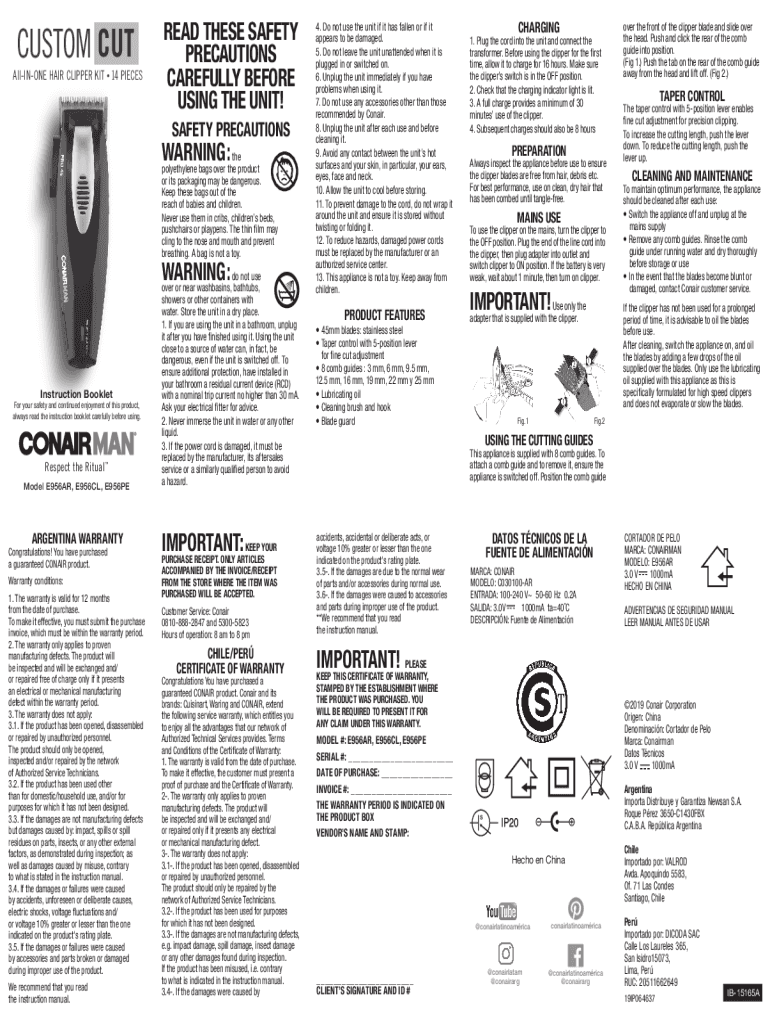 CUSTOM CUT AllINONE HAIR CLIPPER KIT 14 PIECESREAD THESE SAFETY PRECAUTIONS CAREFULLY BEFORE USING THE UNIT! SAFETY PRECAUTIONSWARNING:the polyethylene bags over the product or its packaging may be
