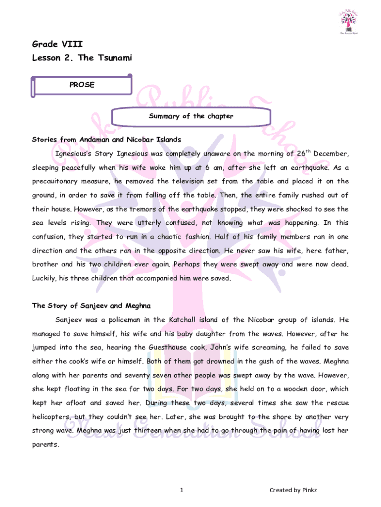 Grade VIII Lesson 2. The Tsunami PROSESummary of the chapterStories from Andaman and Nicobar Islands Ignesiouss Story Ignesious was completely unaware on the morning of 26th December, sleeping peacefully