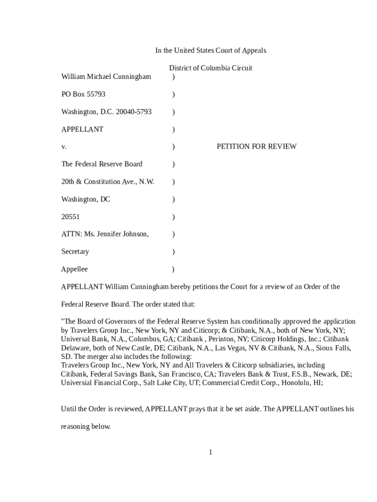 In the United States Court of Appeals William Michael CunninghamDistrict of Columbia Circuit )PO Box 55793)Washington, D.C. 200405793)APPELLANT)v.)The Federal Reserve Board)20th & Constitution Ave.,