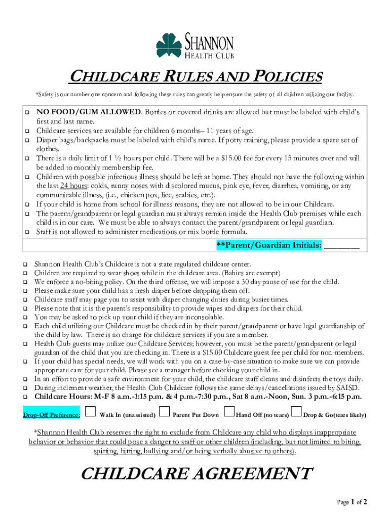 CHILDCARE RULES AND POLICIES *Safety is our number one concern and following these rules can greatly help ensure the safety of all children utilizing our facility. NO FOOD/GUM ALLOWED. Bottles or