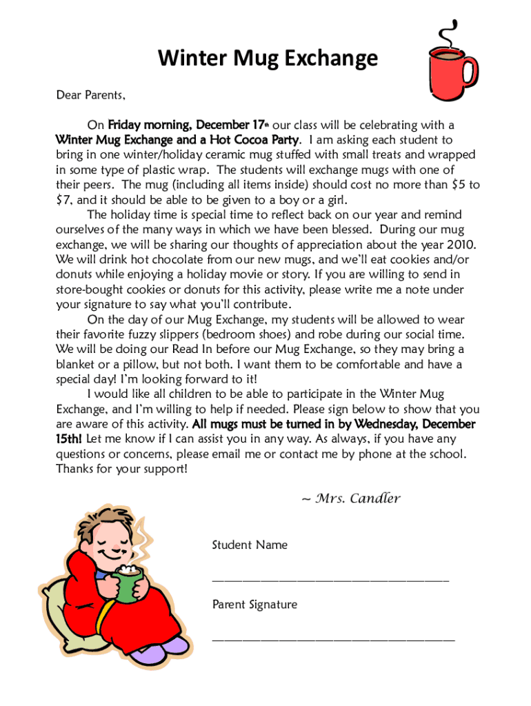 Winter Mug Exchange Dear Parents, On Friday morning, December 17 our class will be celebrating with a Winter Mug Exchange and a Hot Cocoa Party. I am asking each student to bring in one winter/holiday
