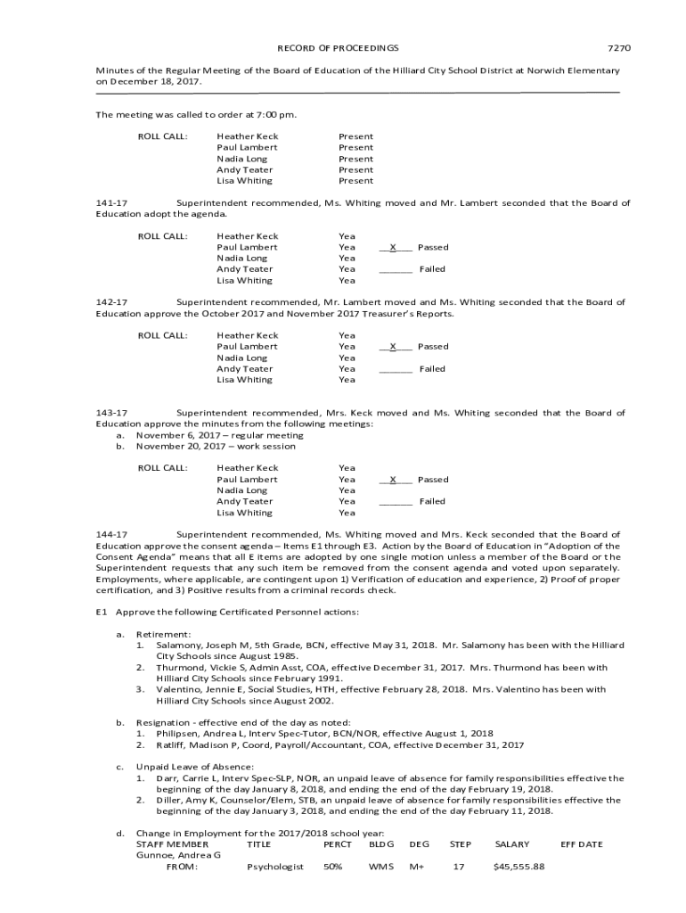 RECORD OF PROCEEDINGS7270Minutes of the Regular Meeting of the Board of Education of the Hilliard City School District at Norwich Elementary on December 18, 2017. The meeting was called to order at