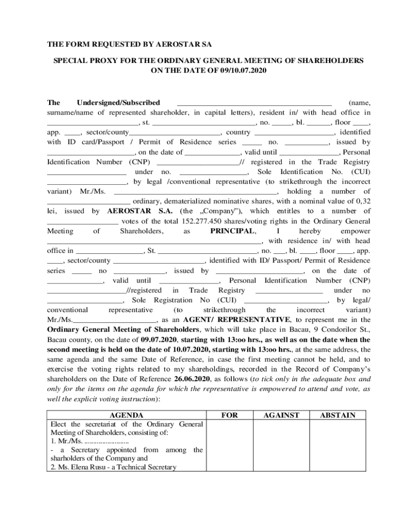 THE FORM REQUESTED BY AEROSTAR SA SPECIAL PROXY FOR THE ORDINARY GENERAL MEETING OF SHAREHOLDERS ON THE DATE OF 09/10.07.2020The Undersigned/Subscribed ___ (name, surname/name of represented shareholder,