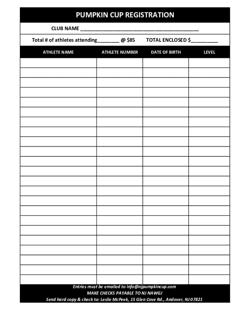 PUMPKIN CUP REGISTRATION CLUB NAME ___ Total # of athletes attending___ @ $85 ATHLETE NAMEATHLETE NUMBERTOTAL ENCLOSED $___ DATE OF BIRTHEntries must be emailed to info@njpumpkincup.com MAKE CHECKS