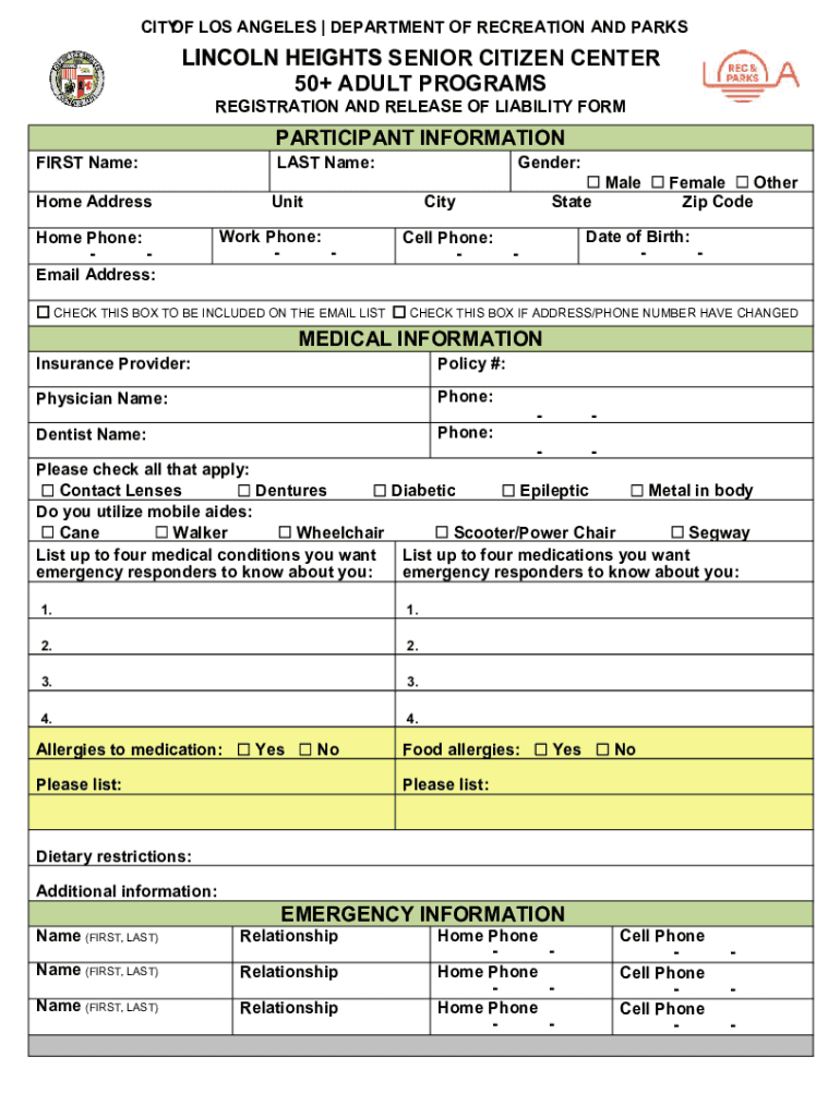 CITYOF LOS ANGELES | DEPARTMENT OF RECREATION AND PARKSSENIOR CITIZEN CENTER 50+ ADULT PROGRAMS REGISTRATION AND RELEASE OF LIABILITY FORMPARTICIPANT INFORMATION FIRST Name:LAST Name:Gender: MaleHome