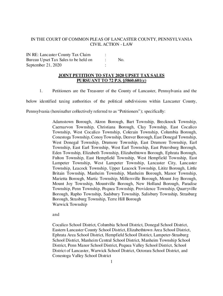 IN THE COURT OF COMMON PLEAS OF LANCASTER COUNTY, PENNSYLVANIA CIVIL ACTION LAW IN RE: Lancaster County Tax Claim Bureau Upset Tax Sales to be held on September 21, 2020: : :No.JOINT PETITION TO STAY