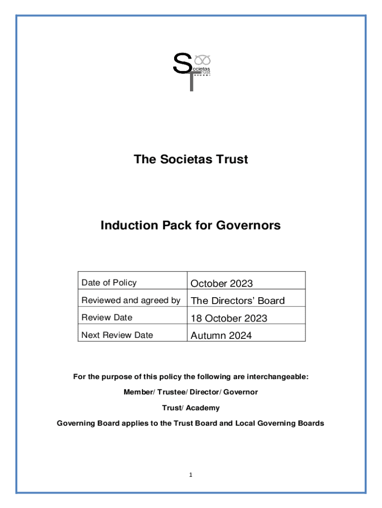 The Societas TrustInduction Pack for GovernorsDate of PolicyOctober 2023Reviewed and agreed byThe Directors BoardReview Date18 October 2023Next Review DateAutumn 2024For the purpose of this policy