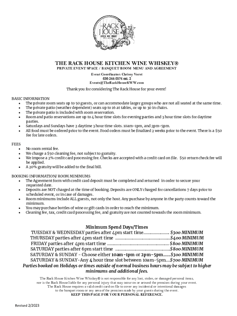 PRIVATE EVENT SPACE / BANQUET ROOM MENU AND AGREEMENT