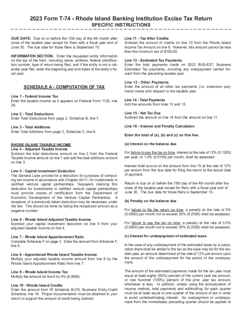 2023 Form T74 Rhode Island Banking Institution Excise Tax Return