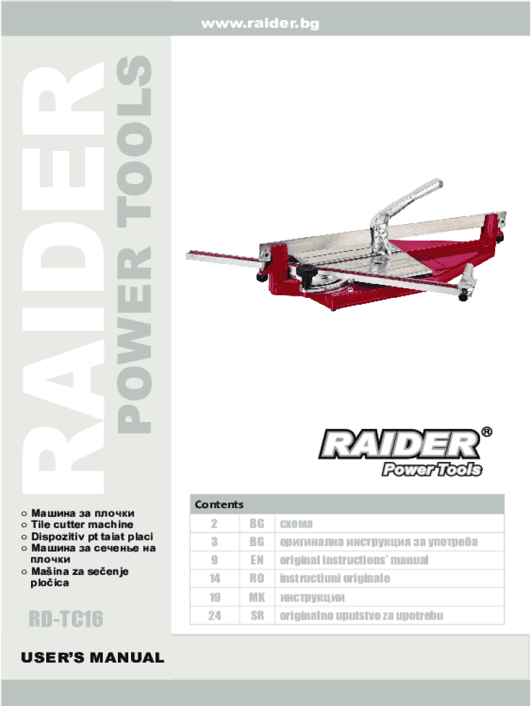 RAIDER power toolswww.raider.bg Tile cutter machine Dispozitiv pt taiat placi Maina za seenjeploicaRDTC16 USERS MANUALContents 2BG3BG 9ENoriginal instructions manual14ROinstructiuni originale19MK24SRoriginalno