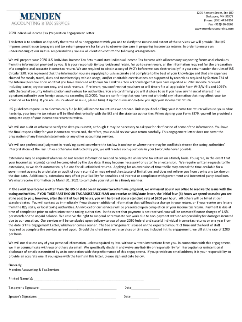 1275 Ramsey Street, Ste 100 Shakopee, MN 55379 Phone: (952) 4458753 Fax: (952)4960165 www.mendenaccounting.com2020 Individual Income Tax Preparation Engagement Letter This letter is to confirm and