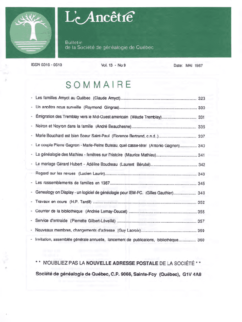 ISSN 0316 0513Vol. 13 N09.\'Date: MAI 1987SOMMAIRE Les famillesAmyotau Qubec(ClaudeAmyot)..n...nn\" Unanctrenoussurveille (RaymondGingras)o..nNoiron et Noyron dans la famille (Andr Beauchesne)Marie