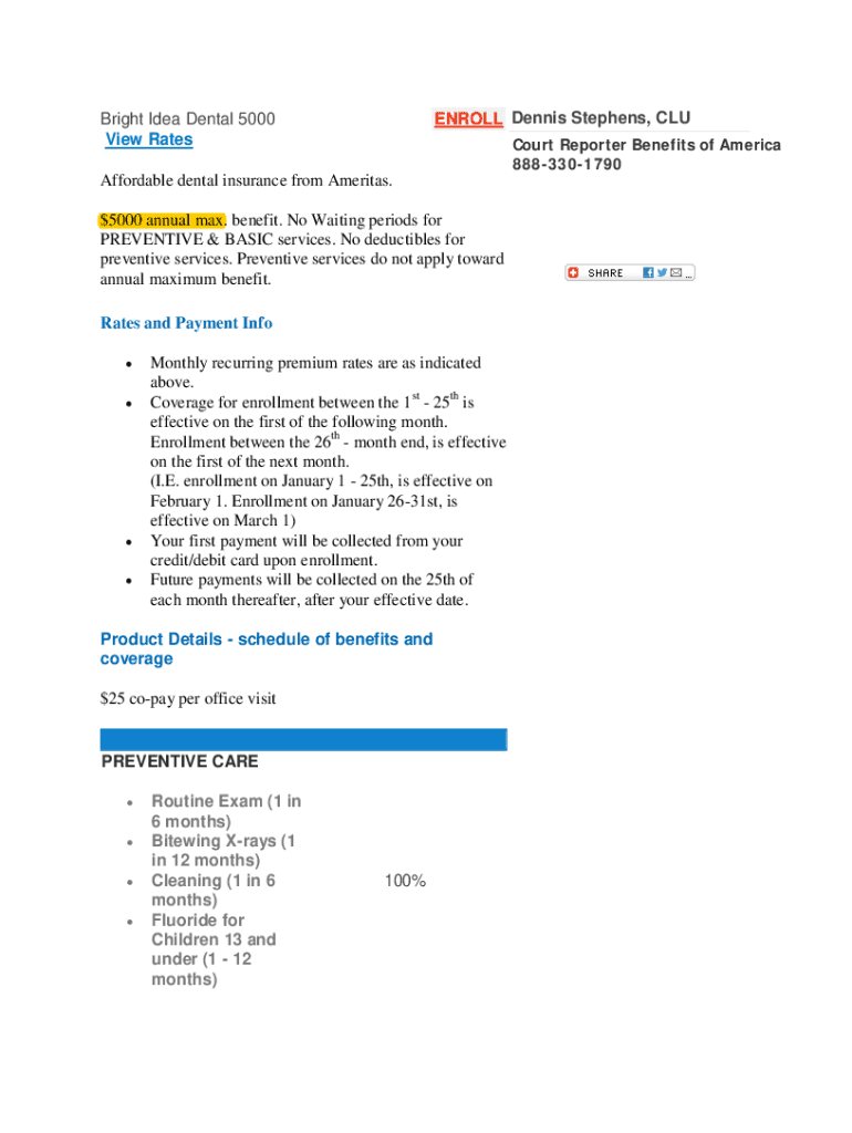 ENROLL Dennis Stephens, CLUBright Idea Dental 5000 View Rates Affordable dental insurance from Ameritas.$5000 annual max. benefit. No Waiting periods for PREVENTIVE & BASIC services. No deductibles