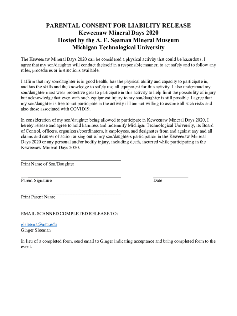 PARENTAL CONSENT FOR LIABILITY RELEASE Keweenaw Mineral Days 2020 Hosted by the A. E. Seaman Mineral Museum Michigan Technological University The Keweenaw Mineral Days 2020 can be considered a physical