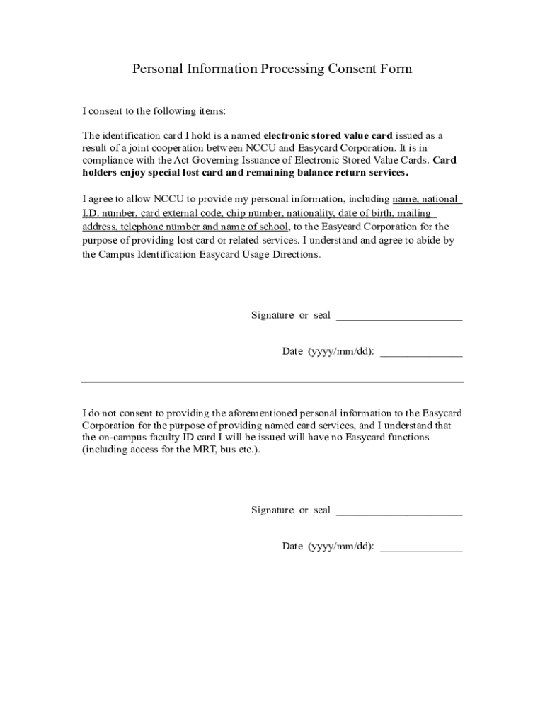 Personal Information Processing Consent Form I consent to the following items: The identification card I hold is a named electronic stored value card issued as a result of a joint cooperation between