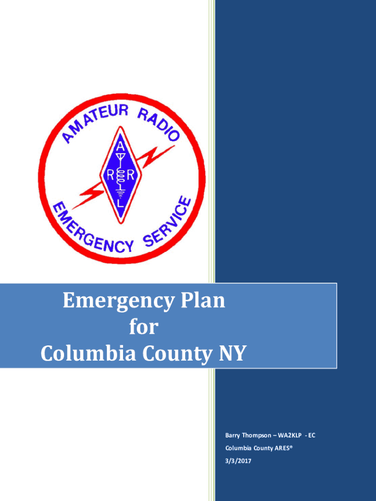 Emergency Plan for Columbia County NY Barry Thompson WA2KLP EC Columbia County ARES 3/3/20171. INTRODUCTION 1.1. The Columbia County Amateur Radio Emergency Service, herein referred to as CARES for