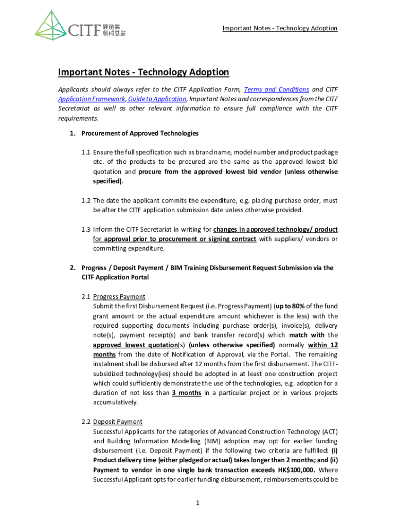 Important Notes Technology AdoptionImportant Notes Technology Adoption Applicants should always refer to the CITF Application Form, Terms and Conditions and CITF Application Framework, Guide to Application,