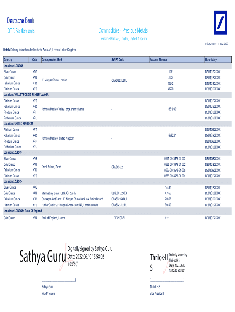 Deutsche Bank Foreign Exchange, Rates & Credit Derivatives and CommodityOTC SettlementsDeutsche Bank AG, London, United Kingdomash Settlement Instructions for Deutsche Bank AG, London, United KingdomEffective