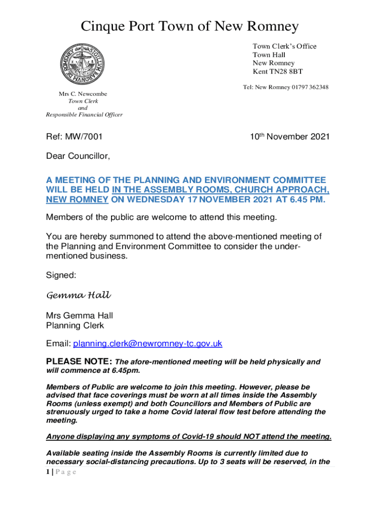 Cinque Port Town of New Romney Town Clerks Office Town Hall New Romney Kent TN28 8BT Tel: New Romney 01797 362348 Mrs C. Newcombe Town Clerk and Responsible Financial OfficerRef: MW/700110th November