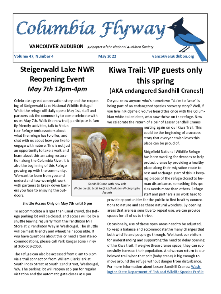 Columbia Flyway VANCOUVER AUDUBONA chapter of the National Audubon SocietyVolume 47, Number 4Steigerwald Lake NWR Reopening Event May 7th 12pm4pmMay 2022vancouveraudubon.orgKiwa Trail: VIP guests
