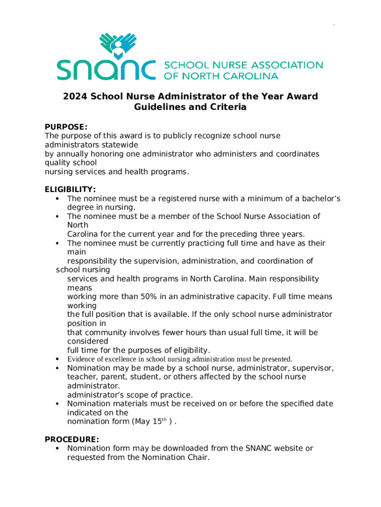 Instructions for the form Nominate for this years Excellence in School Nursing Award