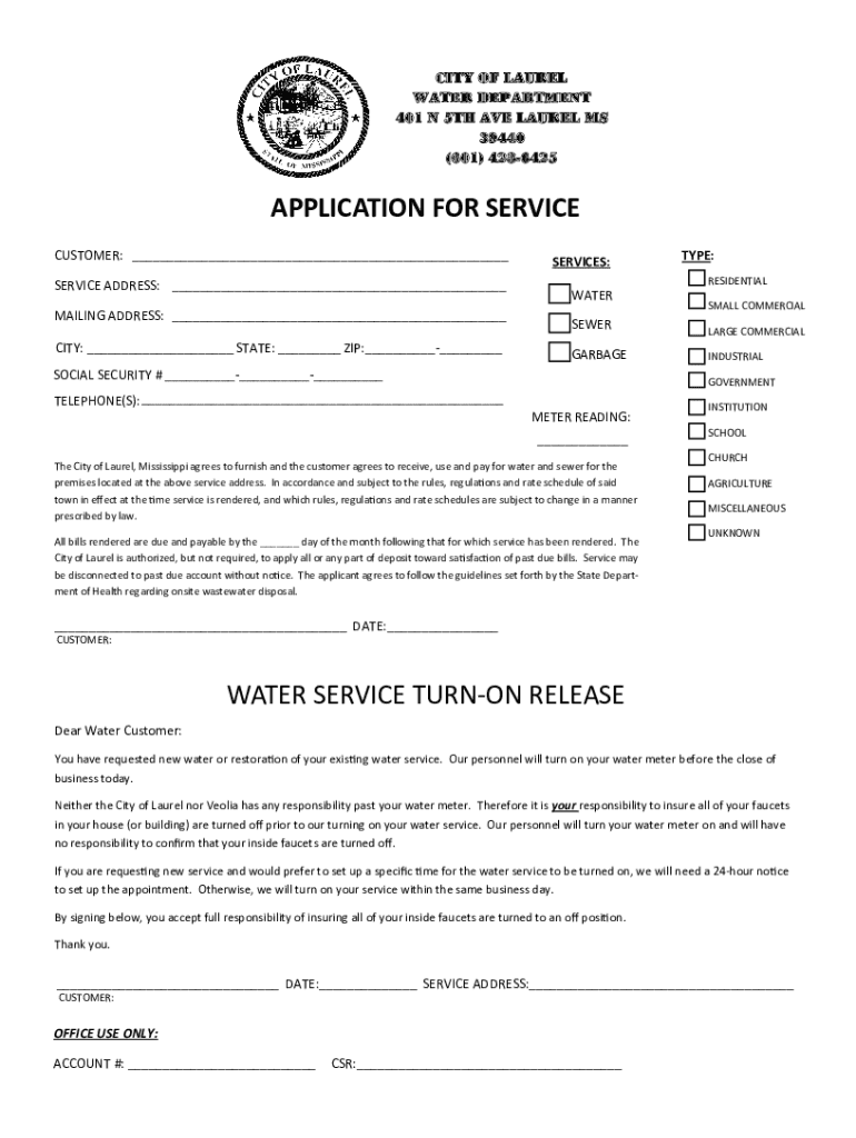 CITY OF LAUREL WATER DEPARTMENT 401 N 5TH AVE LAUREL MS 39440 (601) 4286425APPLICATION FOR SERVICE CUSTOMER: ___ SERVICE ADDRESS: ___ MAILING ADDRESS: ___CITY: ___ STATE: ___ ZIP:______SERVICES:TYPE:
