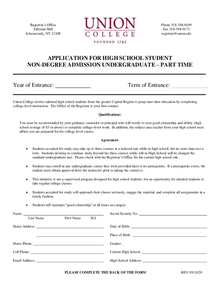 Registrars Office Silliman Hall Schenectady, NY 12308Phone 5183886109 Fax 5183886173 registrar@union.eduAPPLICATION FOR HIGH SCHOOL STUDENT NONDEGREE ADMISSION UNDERGRADUATE PART TIME ___ Year of
