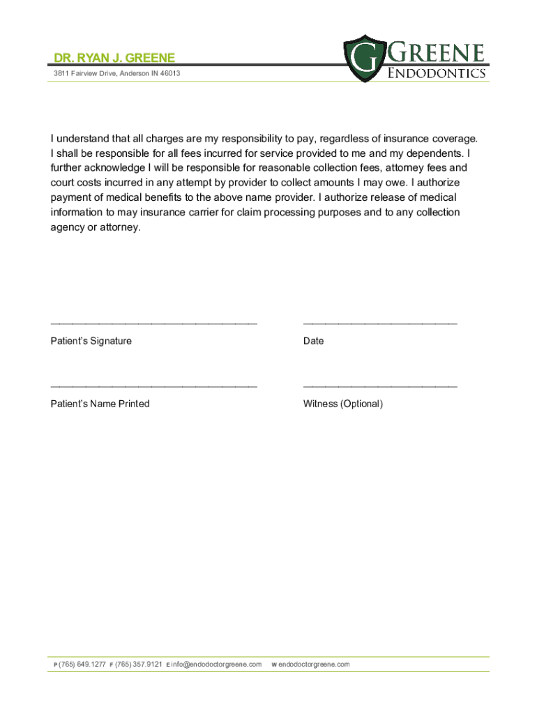 DR. RYAN J. GREENE 3811 Fairview Drive, Anderson IN 46013I understand that all charges are my responsibility to pay, regardless of insurance coverage. I shall be responsible for all fees incurred
