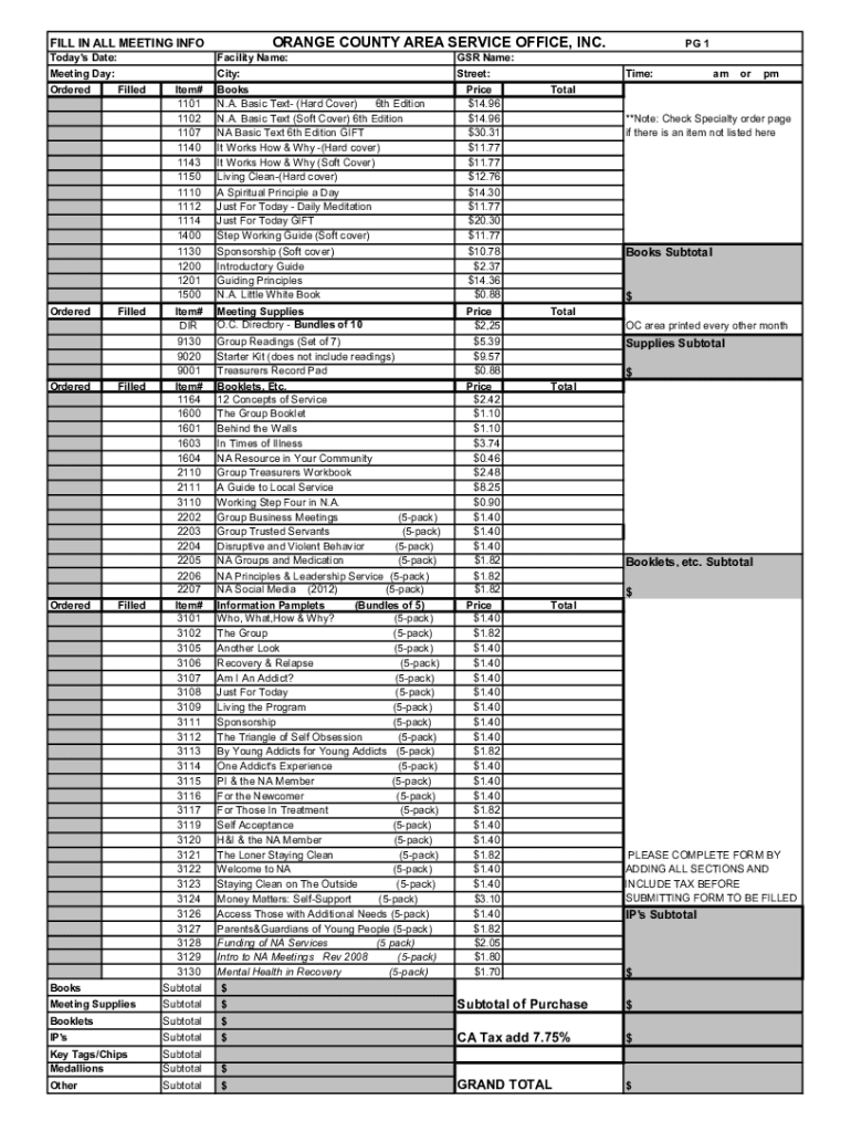 ORANGE COUNTY AREA SERVICE OFFICE, INC.FILL IN ALL MEETING INFO Today\'s Date: Meeting Day: OrderedOrderedOrderedOrderedFacility Name: City: FilledFilledFilledFilledGSR Name: Street:Time:Item# 1101