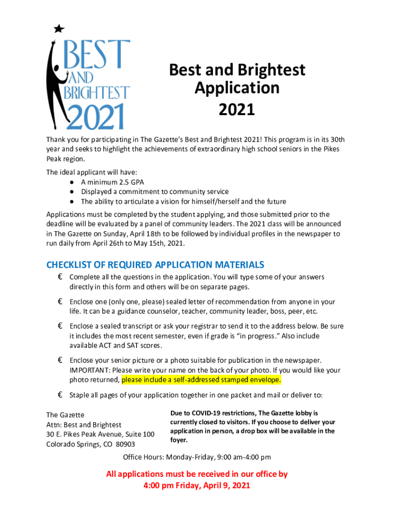 Best and Brightest Application 2021 Thank you for participating in The Gazettes Best and Brightest 2021! This program is in its 30th year and seeks to highlight the achievements of extraordinary high