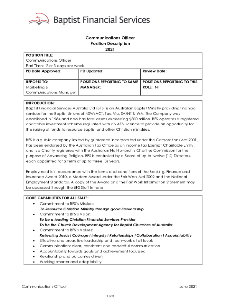 Communications Officer Position Description 2021 POSITION TITLE: Communications Officer Part Time; 2 or 3 days per week PD Date Approved:PD Updated:Review Date:REPORTS TO: Marketing & Communications