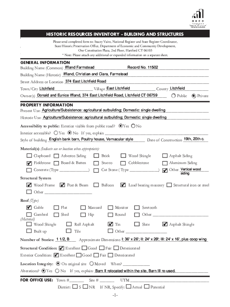 HISTORIC RESOURCES INVENTORY BUILDING AND STRUCTURES Please send completed form to: Stacey Vairo, National Register and State Register Coordinator, State Historic Preservation Office, One Department