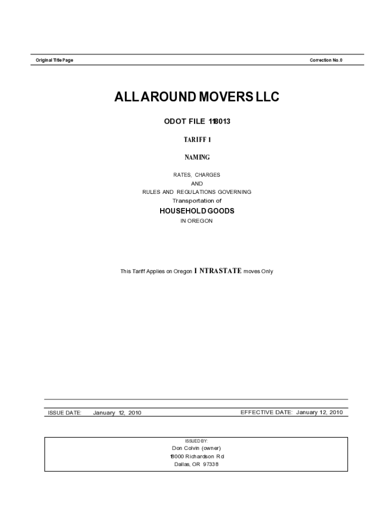 Original Title PageCorrection No. 0ALL AROUND MOVERS LLC ODOT FILE 118013 TARI FF 1 NAMING RATES, CHARGES AND RULES AND REGULATIONS GOVERNING Transportation ofHOUSEHOLD GOODS IN OREGONThis Tariff