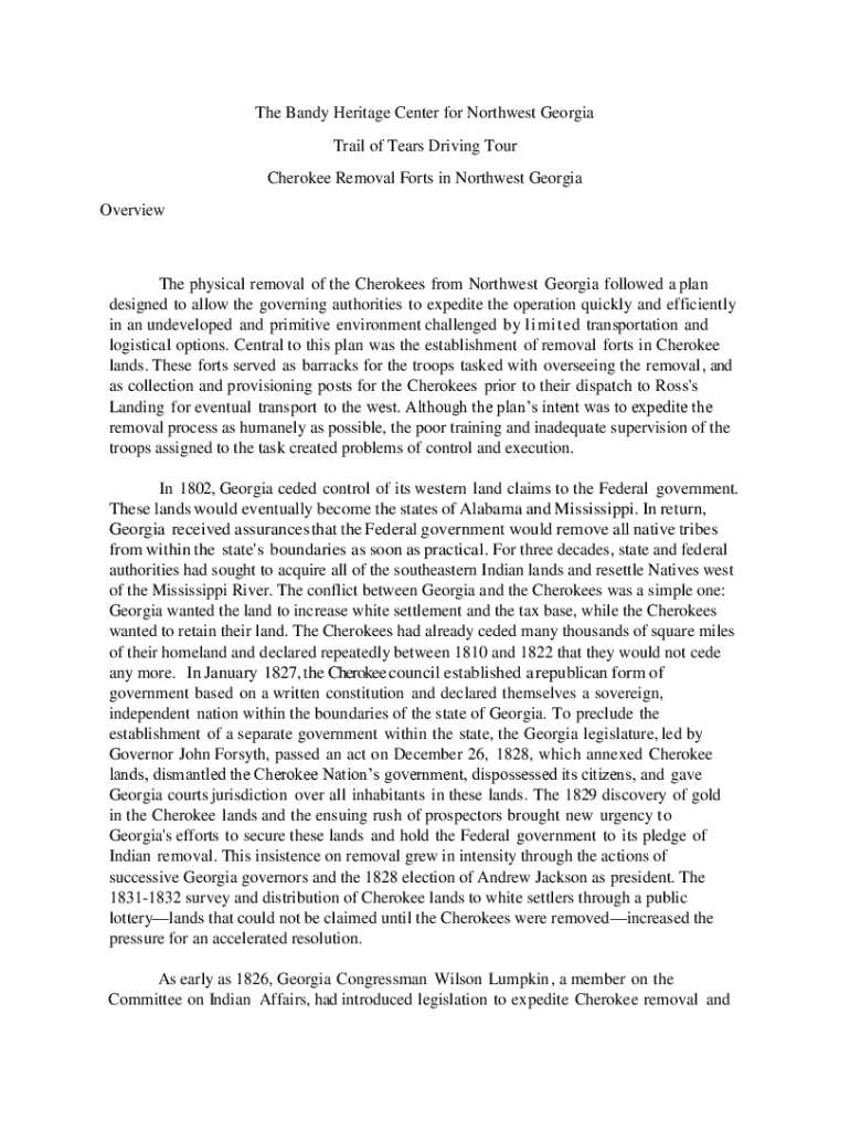 The Bandy Heritage Center for Northwest Georgia Trail of Tears Driving Tour Cherokee Removal Forts in Northwest Georgia OverviewThe physical removal of the Cherokees from Northwest Georgia followed