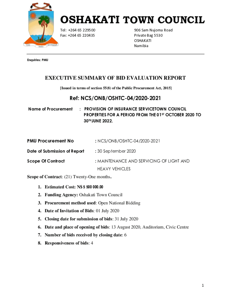 OSHAKATI TOWN COUNCIL Tel: +264 65 229500 Fax: +264 65 220435906 Sam Nujoma Road Private Bag 5530 OSHAKATI NamibiaEnquiries: PMUEXECUTIVE SUMMARY OF BID EVALUATION REPORT [Issued in terms of section