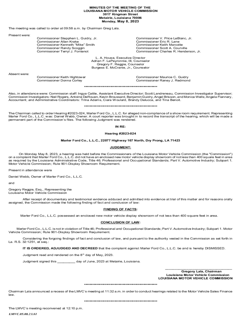 MINUTES OF THE MEETING OF THE LOUISIANA MOTOR VEHICLE COMMISSION 3017 Kingman Street Metairie, Louisiana 70006 Monday, May 8, 2023 The meeting was called to order at 09:58 a.m. by Chairman Greg Lala.