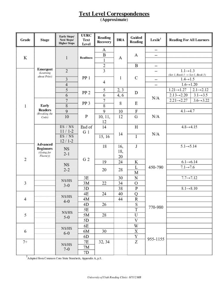 Text Level Correspondences (Approximate)GradeStageKEarly Steps/ Next Steps/ Higher Steps1 Emergent (Learning about Print)1Early Readers (Breaking the Code)2A B 1 2 3Readiness3 4 5 6 7 8 9 10PP 1ES