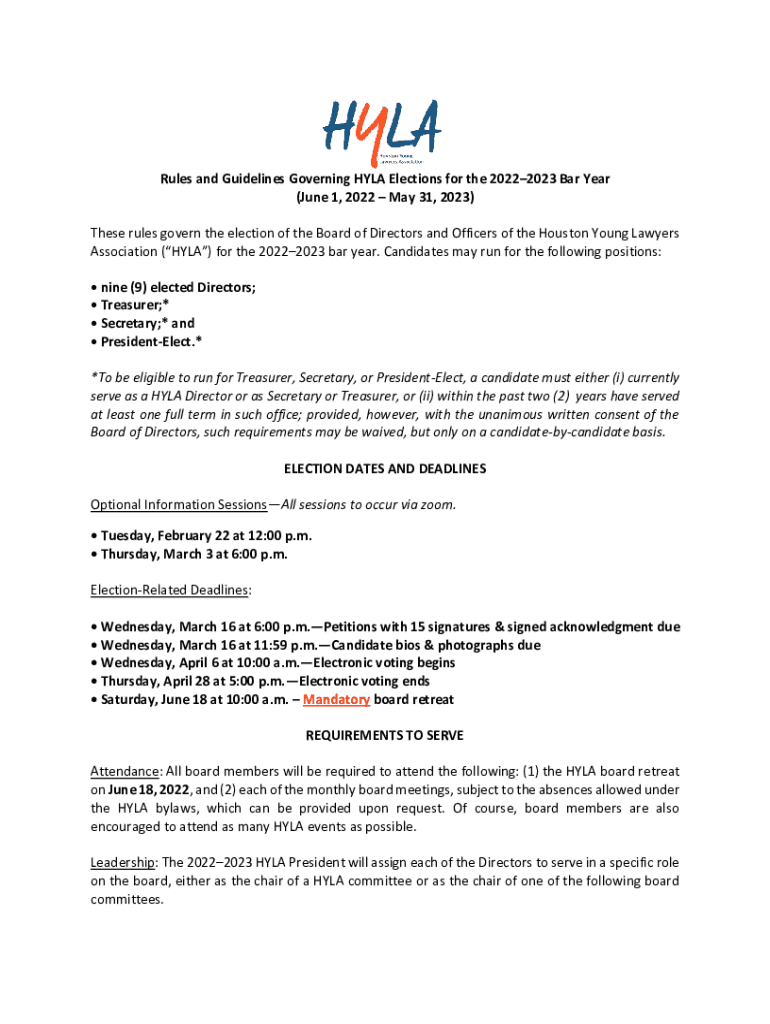 Rules and Guidelines Governing HYLA Elections for the 20222023 Bar Year (June 1, 2022 May 31, 2023) These rules govern the election of the Board of Directors and Officers of the Houston Young Lawyers