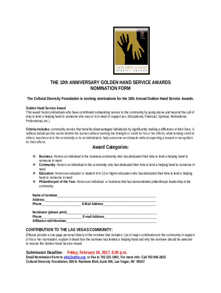 The Golden Hand Service Awards is a writable document required to be submitted to the relevant address to provide certain info. It needs to be completed and signed, which can be done manually in hard copy, or via a particular solution e. g. PDFfiller. It allows to complete any PDF or Word document right in the web, customize it depending on your requirements and put a legally-binding electronic signature. Right away after completion, you can send the Golden Hand Service Awards to the relevant receiver, or multiple individuals via email or fax. The editable template is printable too due to PDFfiller feature and options proposed for printing out adjustment. In both electronic and in hard copy, your form will have a clean and professional look. Also you can save it as the template to use later, so you don't need to create a new document from the beginning. All you need to do is to amend the ready document.