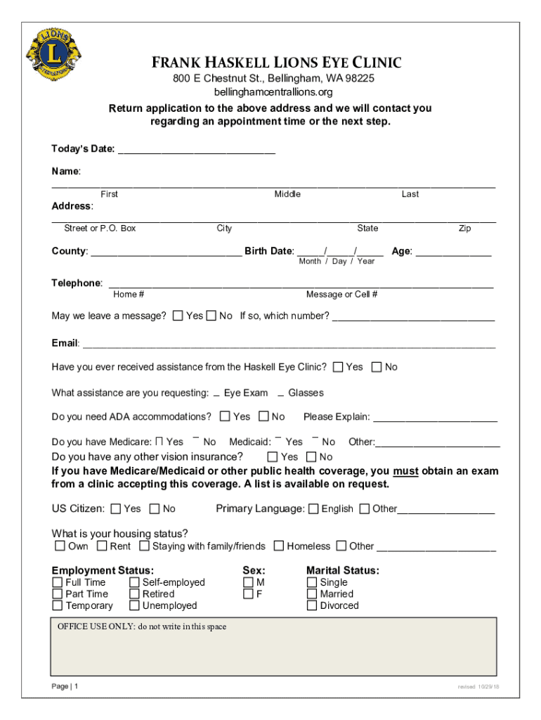 FRANK HASKELL LIONS EYE CLINIC 800 E Chestnut St., Bellingham, WA 98225 bellinghamcentrallions.orgReturn application to the above address and we will contact you regarding an appointment time or the