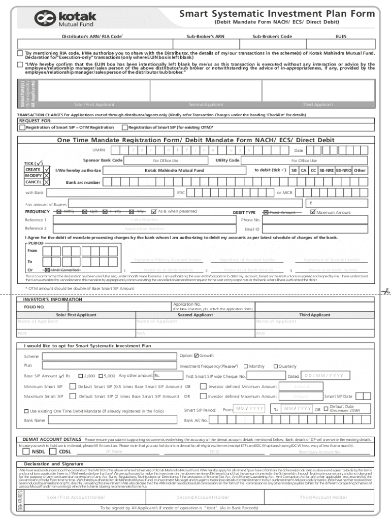 Smart Systematic Investment Plan Form (Debit Mandate Form NACH/ ECS/ Direct Debit)Distributors ARN/ RIA Code#SubBrokers ARNSubBrokers CodeEUIN# By mentioning RIA code, I/We authorize you to share