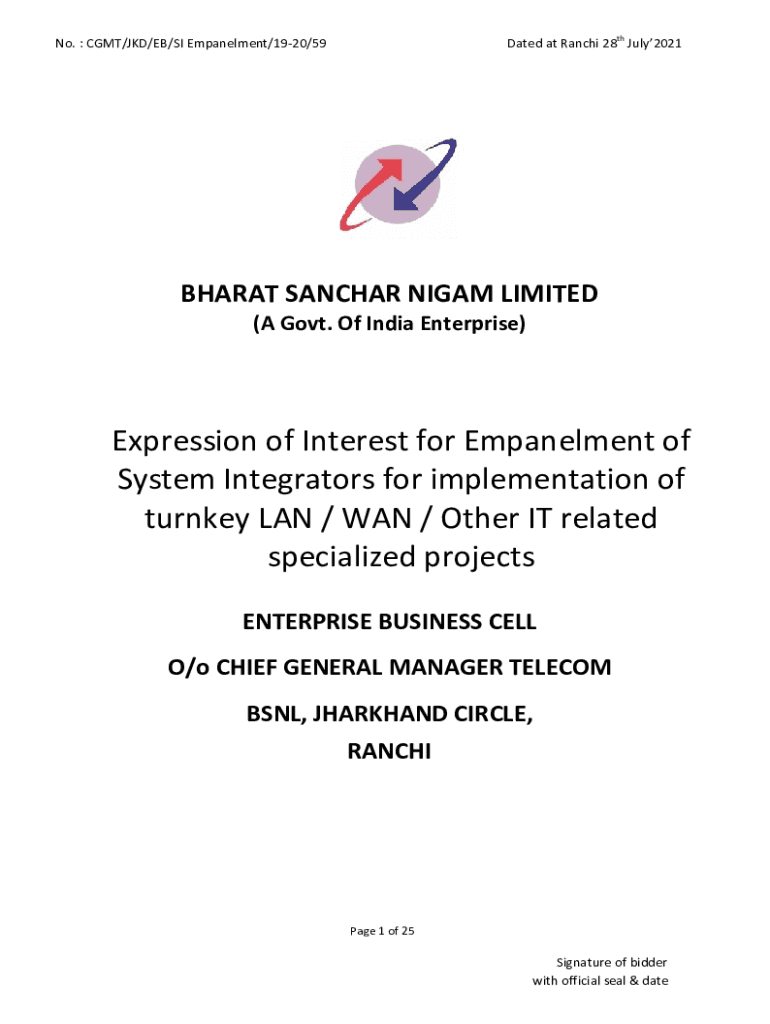 Dated at Ranchi 28th July2021No. : CGMT/JKD/EB/SI Empanelment/1920/59BHARAT SANCHAR NIGAM LIMITED (A Govt. Of India Enterprise)Expression of Interest for Empanelment of System Integrators for implementation
