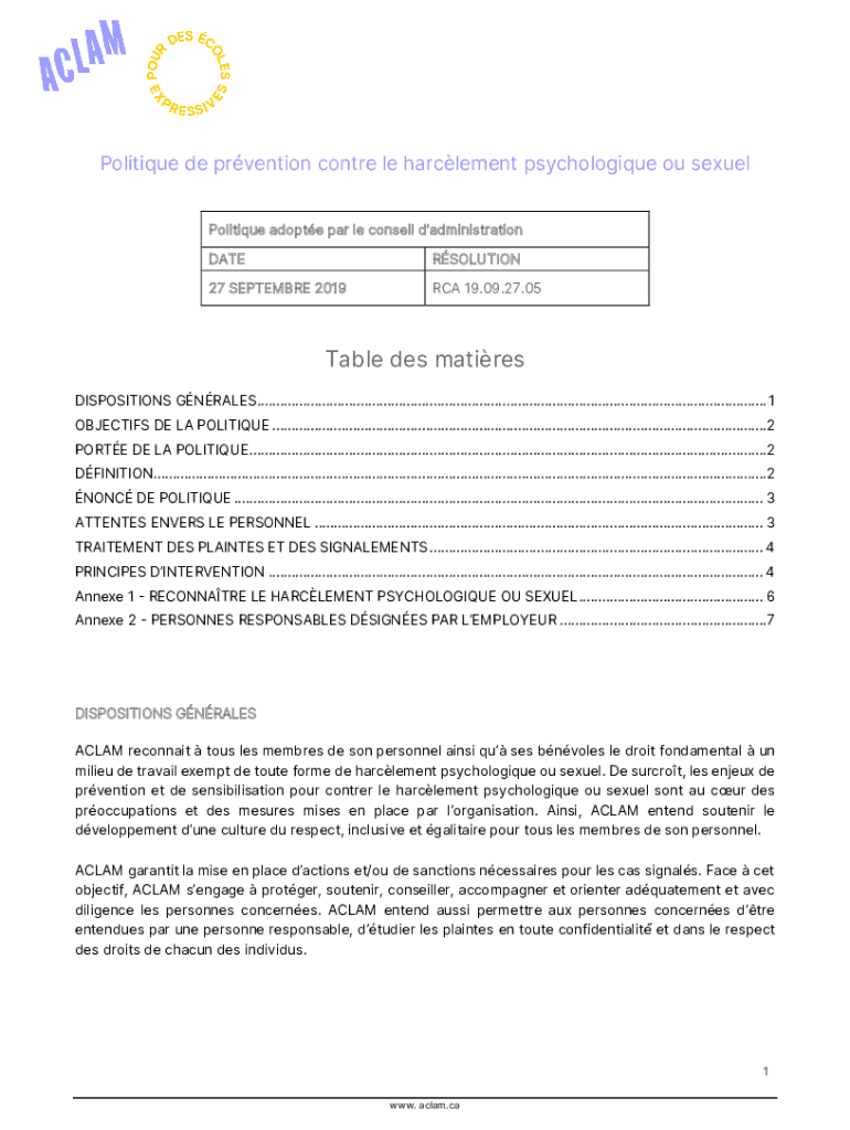 Politique de prvention contre le harclement psychologique ou sexuel Politique adopte par le conseil dadministration DATERSOLUTION27 SEPTEMBRE 2019RCA 19.09.27.05Table des matires DISPOSITIONS GNRALES