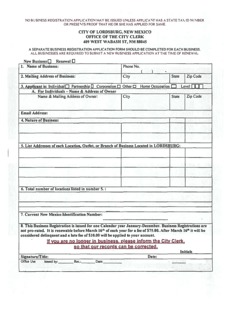 HAS A STATE TAX ID NUMBER NO BUSINESS REGISTRATIONAPPLICATION MAY BE ISSUED UNLESS APPLICA OR PRESENTS PROOF THAT HE OR SHE HAS APPLIED FOR SAME.CITY OF LORDSBURG, NEW MEXICO OFFICE OF THE CITY CLERK