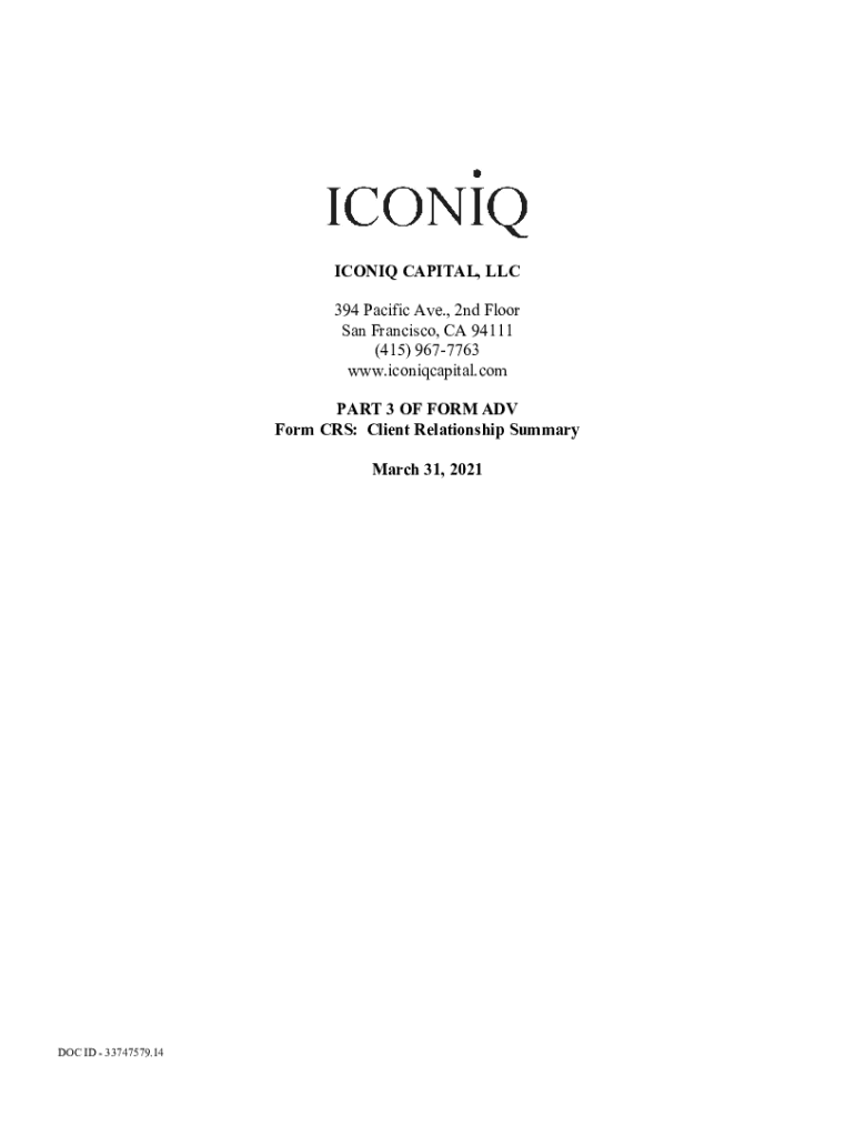ICONIQ CAPITAL, LLC 394 Pacific Ave., 2nd Floor San Francisco, CA 94111 (415) 9677763 www.iconiqcapital.com PART 3 OF FORM ADV Form CRS: Client Relationship Summary March 31, 2021DOC ID 33747579.14ICONIQ